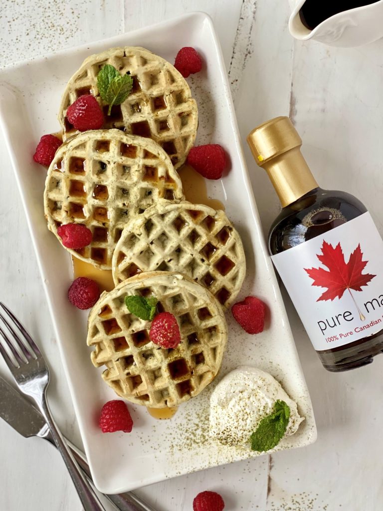 These matcha and white chocolate waffles are ideal for St Patrick’s Day. Serve with whipped cream, raspberries, and a generous drizzle of maple syrup.