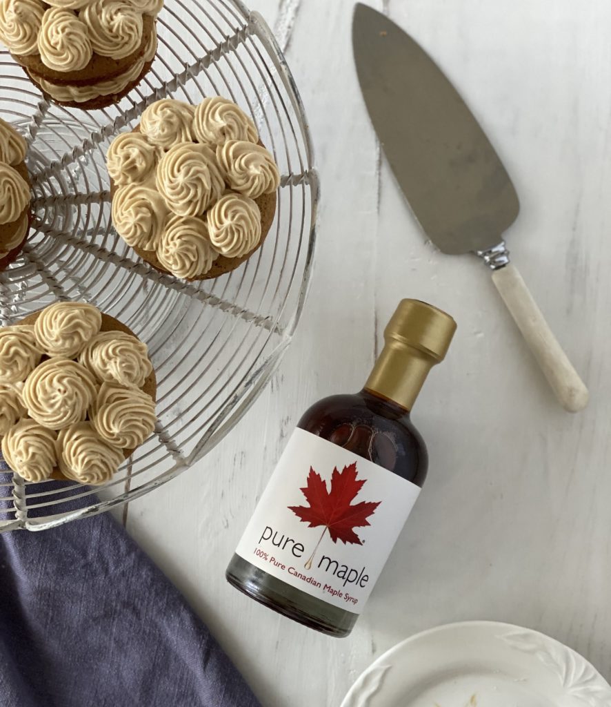 - While the cakes bake, make the buttercream by beating the butter, then gradually adding the icing sugar. Mix in the maple syrup and milk.
